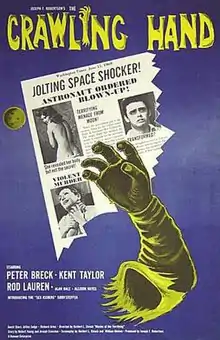 The Crawling Hand is a 1963 American science fiction horror film directed by Herbert L. Strock, and starring Peter Breck, Kent Taylor, Rod Lauren, Alan Hale and Allison Hayes.[3] It was later featured on the television shows Mystery Science Theater 3000 (MST3K) and The Canned Film Festival.[4]