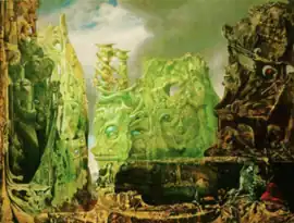 For The Eye of Silence Max Ernst employed a technique called decalcomania to create arbitrary textures on the canvas, which he then reworked to resemble rock formations and forms of animals, plants, and architecture.[4] The imagery on the surrealist canvas has been described as a primordial-like landscape, "in which rock-hard and gelatinous formations coexist under a forbidding sky."[1] The Eye of Silence has also been described as, "part vegetation, part rock and part bejewelled baroque palace. A fusion of animal, mineral and vegetable, the painting's texture suggests bone, rag, feather and stone all at once, whilst the lake or chasm situated in its middle ground is carved out of a rock placed illogically against the sky…"[3] to ma lesa