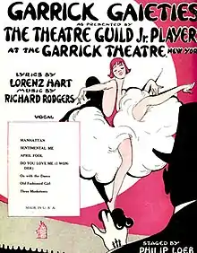 It debuted in 1925 on Broadway and was the first of three Garrick Gaiety revues, which were subsequently produced in 1926 and 1930. The show parodied current subjects, such as the New York City Subway system and the Theatre Guild (producer of the show). The Garrick Gaieties is remembered as "bringing Rodgers and Hart their first major recognition." Their hit song "Manhattan" was introduced in this revue.[1]