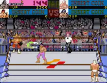 Adding coins to increase "health" did little to revive the player's wrestler after a lengthy beating or even increase his chances of kicking out of a pin. Also, as the game progressed, the computer opponents became more difficult to beat, the CPU's illegal partner constantly breaking the player's pins and submissions. However, pinfall victories in these harder levels can still be achieved after performing a certain number of pin attempts. If the players move all the way up the ranks and win the Championship Title they defend it against the computer who becomes even more difficult.