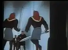 Sensing that the needle missed, the sarcophagus opens and a light from the dead king's jeweled amulet awakens his giant guards. The guards attack Clark, Lois and the professor. Clark is thrown into a sarcophagus, where he quickly changes into Superman. As Superman, he defeats the giant guards and saves Lois and the professor from a grim demise by fire.