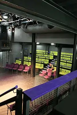 The theatre had one wall with a fixed block of 40 seats and three balconies, with the remaining seats moveable according to the needs of each production According to the company, there was "one main route onto the stage for the performers, but also a few secret passages to add an element of surprise."[2]