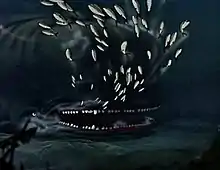 In the 1940 Walt Disney film Pinocchio, the Dogfish is named Monstro (which is Portuguese, Esperanto, and archaic Italian for "monster") and is portrayed as a gigantic, sadistic, terrible, aggressive, intelligent, vicious, man-eating sperm whale, in contrast with the "gentle giants of the sea" in real life, with massive jaws, both of which have sharp teeth, and a grooved underside like a rorqual. He is first mentioned by Jiminy Cricket in a message from the Blue Fairy about Geppetto, who, sailing to find Pinocchio, has been swallowed by the whale.[1] They search for Monstro, but are frustrated upon mentioning his name to the sea creatures which causes them to flee in terror. After finally discovering Monstro sleeping, he suddenly awakens upon noticing a school of tuna swimming nearby and gives chase, eventually swallowing them and Pinocchio (except Jiminy) before closing his mouth and falling asleep again. Inside Monstro's belly, Pinocchio discovers and reunites with Geppetto before suggesting that they start a fire in order to make Monstro sneeze, the smoke of which wakes him up, prompting the whale to sneeze them out of his mouth. Unfortunately, this serves only to infuriate Monstro after drinking lots of water to put the fire out and he pursues the group, using surprise attacks in order to kill them, but fails. Eventually, when Pinocchio pulls Geppetto into a hole in a cliff, Monstro leaps into the air, aiming to reconsume the two, but ends up smashing against the rocks on impact. It is unknown what exactly happened to him, but due to smashing against the rocks, Monstro was apparently killed by the impact.[2]