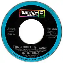 When BluesWay Records released "The Thrill Is Gone" as a single in December 1969, it became one of the most successful of King's career and one of his signature songs. It reached number three in the Billboard Best Selling Soul Singles chart and number 15 in the broader Billboard Hot 100 chart.[5]