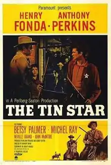 The Tin Star is a 1957 American Western film based on a short story, directed in VistaVision by Anthony Mann and starring Henry Fonda and Anthony Perkins, in one of Perkins' first roles. The film became one of the few low-budget westerns to be nominated for the Oscar for Best Writing, Story or Screenplay. Since its release, the film has become one of the classics of the genre. The supporting cast features Betsy Palmer, Neville Brand, John McIntire and Lee Van Cleef.