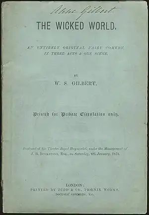 The Wicked World is a blank verse play by W. S. Gilbert in three acts. It opened at the Haymarket Theatre on 4 January 1873 and ran for a successful 145 performances, closing on 21 June 1873.[1] The play is an allegory loosely based on a short illustrated story of the same title by Gilbert, written in 1871 and published in Tom Hood's Comic Annual, about how pure fairies cope with a sudden introduction to them of "mortal love."
