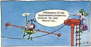 - The King: A pint-sized despot modeled after Napoleon; like many characters in the strip, the king is named simply after his role. Occasionally, his name is given as "Id".[10] "Sire" to his subjects, he is greedy, petty and vindictive, but he maintains a sense of humor. Jokes are often centered on his height (about three feet). He wears a crown and cape that makes him look like a playing card (and in the 1960's and 1970 he did resemble the Jack Card with his crown decorated with the four card suits). From his throne room he hands out terrible, Draconian punishments for crimes (executions being quite common). He is only ever looking to win votes, power and money. He has a thin skin and a short temper (especially about his height), and main characters often find themselves chained to the wall[11] or the rack[12] if they thoughtlessly insult the king. He is hated by the peasants, who to his dismay often proclaim "The king is a fink!" On one occasion the King calls himself a "fink."[13] However, he is occasionally shown to have a quirky softer side, and it is mentioned his only friends are the moat monsters. His "pets" are a dragon and a St. Bernard dog named Bonapart; he rides Bonapart in fox hunts - although he can ride horses as well. An ancestor of the King - who resembles his descendant - was King of Id II who was beheaded by his successor King of Id III.[14] In regard to the King's parents: his father, who was king until his son overthrew him, is kept in a tower[15][16] surrounded by "The King of Id" jack-in-the-box toys — the only gifts his son gives him;[17] he also calls his son "A Fink".[18] His mother works as a charwoman[19] and routinely complains and scolds her son — the only person who ever does so. He has a brother named Cyril.[20] His coat of arms is a picture of his head on the body of a bull.[21] The only time the King has ever won anything honestly is when he found out he was going to be selected to appear on bubble gum "Tyrant Cards" series.[22] When the King was unmarried, he did once ask Snow White to introduce him to the Evil Queen so he could date the Queen;[23] however by February 2016 the King has a Queen named Fanabella and a mother-in-law as well.[24] In a comic crossover in connection with the 75th anniversary of the comic strip "Blondie" the King and Julius Dithers were soul brothers.[25] A running gag is that at Christmas the King tries to get presents from Santa Claus and always fails.[26]