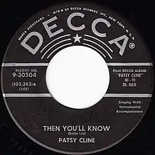 "Then You'll Know" was released on November 18, 1957 via Decca Records. Its flip-side was a remake of a song previously cut by Cline, "I Don't Wanta."[5] The song was also included on Cline's self-titled debut album, which was also issued in 1957 through Decca.[6] To promote the single, Cline attended the WSM Birthday Celebration and D.J. Convention in Nashville, Tennessee on November 13, 1957. According to Cline's biography by Ellis Nassour, Decca Records did not promote the single and disc jockeys "made no effort to play it," resulting in the single become unsuccessful.[7] Thom Jurek of AllMusic gave the song positive reception in his review of 2002 Cline compilation: "'Then You'll Know' offers a view of Chet Artkins' countrypolitan before it ever articulated itself as such," he commented.[8] In a separate review, Stephen Thomas Erlewine highlighted the song as "essential listening".[9]