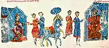 Theophilos was eager for a bride and made the affair into a spectacle, assembling the women in a newly erected and splendid hall in the imperial palace. In the end, Theophilos chose Theodora, and indicated his choice by giving her a golden apple.[18] According to the later chronicler Symeon Logothete, Theophilos had at first been struck by the beauty of another girl, Kassia (later a prominent poet and composer), and cynically said to her that "through a woman, evils came to man" (referring to Eve).[19][20] This comment, deemed by Judith Herrin to have been an "unfortunate way to engage a future wife's affections",[20] prompted Kassia to reply "through a woman, better things began" (referring to the Virgin Mary).[19][20] After Kassia's response, Theophilos, taken aback by the bold retort, passed her by and gave the apple to Theodora.[19][21] According to Warren Treadgold, Theodora was "beautiful,[lower-alpha 3] sensible and adaptable, and suited him well; but Theophilus seems to initially not have realized that his bride, like Euphrosyne, was an iconophile".[18] Theodora was crowned empress in the Church of St Stephen in Daphne[19] on 5 June 830[24] and the couple were then married in the Hagia Sophia.[19]