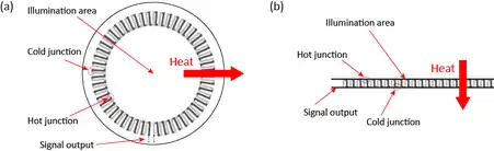 Thermopile discs have thermocouples deposited onto an aluminium plate in a radial arrangement as shown in Fig 3(a).[8] All thermocouples are electrically connected in series with one junction at the circumference of the inner area which is illuminated and the other junction at the outer circumference.[8] The absorption coating in the illuminated area converts radiation into heat which flows radially outwards generating a temperature gradient between inner and outer ring and thus a thermoelectric voltage.[8]