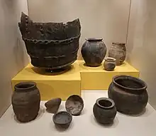Thetford ware is a wheel-turned, mass-produced pottery having a hard, sandy fabric. Fabric colours vary from light to dark grey, and less frequently brownish-orange and buff. There are five types of forms manufactured: cooking pots, storage jars, bowls, pitchers and lamps. The cooking-pots were made in three sizes, with medium being the most commonly produced. The lamps were mostly a type of tall pedestal with hollow bases. Decoration was either unadorned or limited to applied-thumb strip decoration, several styles of rouletting, and incised bands. Rouletting is a process of carving patterns on pottery with a small toothed wheel. Rouletting decoration consisted of diamond and square shapes along with a mixture of diamonds and triangles.[1][2]