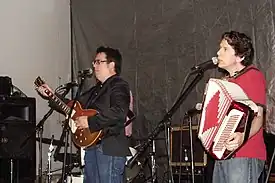 They Might Be Giants (often abbreviated as TMBG) is an American alternative rock band formed in 1982 by John Flansburgh and John Linnell. During TMBG's early years, Flansburgh and Linnell frequently performed as a duo, often accompanied by a drum machine. In the early 1990s, TMBG expanded to include a backing band.[5] The duo has been credited as vital in the creation and growth of the prolific DIY music scene in Brooklyn in the mid-1980s;[6] the duo's current backing band consists of Marty Beller, Dan Miller and Danny Weinkauf.