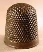 A thimble is a small pitted cup worn on the finger that protects it from being pricked or poked by a needle while sewing. The Old English word þȳmel, the ancestor of thimble, is derived from Old English þūma, the ancestor of the English word thumb.[1]