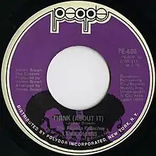 "Think (About It)" is a funk song recorded by Lyn Collins and released as a single on James Brown's People Records in 1972. The recording was produced by Brown (who also wrote the song) and features instrumental backing from his band The J.B.'s. It was the title track of Collins' 1972 debut album. The song is very popular for its raw drumbeat dressed with tambourine and multiple background vocals, which suggest the song was recorded altogether in one take, with Jabo Starks playing drums. It peaked at No. 9 on the Billboard Best Selling Soul Singles chart and No. 66 on the Hot 100.[1] Owing to the composition, it became a fan favourite and has been featured on various compilation albums posthumously. In the closing lyrics, Collins sings lines from "Think", which shows that this song was one of the few adaptations of the 5 Royales song that Brown loved to do. Think (About It) is among the most sampled songs of all-time.
