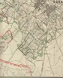 The EEF's occupation of Gaza was not strongly resisted and a general advance during the morning of 7 November found the town abandoned.[68] Orders for an attack at 04:50 by the 75th Division on Outpost Hill on the eastern side of Gaza had been issued; these were expanded to include Middlesex Hill and a 54th (East Anglian) Division attack on the Belah and Yunis trenches, and Turtle Hill in the coastal sector.[63][72][75] However, by 04:35, two battalions each from the 161st and the 162nd Brigades (54th Division) supported by artillery had already advanced to occupy Lion and Tiger Trenches and Sheikh Redwan in the coastal sector to the north-north-west of Gaza. The advance by the 162nd Brigade took them through "the gardens and fields of Gaza to the main road northwards", when patrols sent into the city found it deserted. British artillery had destroyed all the homes of the 40,000 people who had lived in Gaza before the war. The 54th (East Anglian) Division subsequently took up a line stretching from the Jaffa road north of Sheikh Redwan to the Mediterranean sea.[82][83]