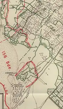 On 1 November, the assault of Umbrella Hill—a sand dune two thousand yards (1,800 m) south–west of Gaza to the west of the Rafa to Gaza road overlooking the main objectives—was to begin at 23:00.[37][38][50] The defending garrison was "assumed to be about 350 strong".[40] However, at 10:50 a preliminary move into No Man's Land was observed by Ottoman soldiers in Fisher's Orchard, who gave the alarm and began firing machine guns and rifles from the Ottoman trenches on Umbrella Hill.[51] At 23:00, an intense EEF bombardment began enabling a tape to be laid, along which the attacking troops formed up to launch their attack ten minutes later.[51] Under cover of the intense ten-minute bombardment, the 1/7th Battalion, Scottish Rifles with one company of 1/8th Battalion, Scottish Rifles (156th Brigade, 52nd (Lowland) Division) attacked Umbrella Hill.[49] After killing many of the defenders, they quickly captured the hill, three officers, fifty-five Ottoman soldiers, three Lewis guns and numerous bombs. The attackers suffered light casualties; however the sand dune was difficult to defend because the Ottoman trenches—without revetments—had virtually disappeared during the previous bombardments. The following Ottoman bombardment of Umbrella Hill caused 103 casualties to the 1/7th Battalion Scottish Rifles during the next twenty-four hours.[51] However, with the hill captured by the 52nd (Lowland) Division, the main attack could begin.[37]