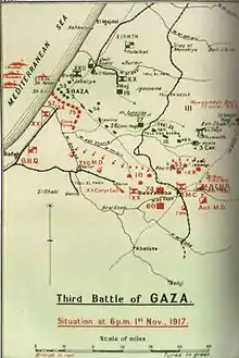 Meanwhile, preparations for the main attacks on the Gaza line at Hareira and Sharia, began on 1 November when the 53rd (Welsh) Division, with the Imperial Camel Brigade on the right, advanced northwards to occupy a line 3 miles (4.8 km) to the west without opposition. This placed the infantry in a position from which they could cover the right flank of the proposed attack by the XX Corps on Hareira and Sheria.[6][16]