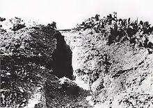 The Third Battle of Gaza was never intended to capture the town, but to keep the garrison in place after the capture of Beersheba. Only the first line of Ottoman trenches had been the objectives of the XXI Corps, which used new infantry tactics, tanks and massed artillery organised in accordance with Western Front standards.[62] Although all objectives had not been won, the operations had forced two regiments of the Ottoman 7th Division reserve to move away from Hareira and Sheria, forward to strengthen the Ottoman defences between Gaza and the sea. According to the British official historian, "The attack on the western defences of Gaza ... had fulfilled the Commander-in-Chief's object." The EEF had also inflicted severe losses on the Ottoman defenders; more than one thousand of whom the EEF buried in the captured trenches. The EEF captured twenty-eight officers, 418 soldiers, twenty-nine machine guns and seven trench mortars.[63] During the fighting, the corps infantry had advanced about two miles (3.2 km) on a five thousand yards (4.6 km) front, and held their gains against repeated Ottoman counterattacks, although the attempt to create a gap for the Imperial Service Cavalry Brigade to ride through was not successful.[64] The front line defensive system on the south–west side of Gaza had been captured and the infantry occupied a position from which they could threaten "Ali Muntar and the rest of the defences in front of the town." The XXI Corps suffered 350 killed, 350 missing and two thousand wounded during this fighting.[50][56][65] Many casualties were blamed on loss of direction and crowding in the captured trenches, which were too shallow.[63]