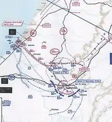After launching the successful attack on 6 November against Hareira, the Sheria trenches were also attacked late in the day. These attacks were supported by renewed attacks in the Tel el Khuweilfe area at the eastern extremity of the Ottoman front line.[77] During these attacks, the whole of the Kawukah trenches and part of the Rushdi system which protected Hareira Redoubt, were captured and the Ottoman defenders were forced to withdraw to the Hareira Redoubt.[78] Late in the day a large part of the Sheria defences were also captured after Hareira was bypassed. Only Tel esh Sheria blocked the British advance and Allenby ordered the next day's attacks to continue on Tel esh Sheria, and to be renewed at Gaza.[72][79][80] While these attacks took place on 6 November, EEF aircraft bombed Gaza, the main Ottoman positions behind the Kauwukah defences near Um Ameidat, and positions west of Sheria. Three air combats were also fought against three hostile aircraft during the day.[75] Mejdel was also bombed by EEF aircraft.[67] Allenby wrote: