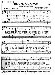 When Rev. Babcock lived in Lockport, New York, he took frequent walks along the Niagara Escarpment to enjoy the overlook's panoramic vista of upstate New York scenery and Lake Ontario, telling his wife Katherine he was "going out to see the Father's world".[1] He died in 1901 at age 42. Shortly after his death Katherine published a compilation of Babcock's writings entitled Thoughts for Every-Day Living that contained the poem "My Father's World".[2] The original poem contained sixteen stanzas of four lines each.[3] The poem was set to music in 1915 by Franklin L. Sheppard, a close friend of Babcock. The tune name, TERRA BEATA, means “blessed earth” in Latin.[4] Sheppard adapted the music from a traditional English melody that he learned from his mother as a child.[5]