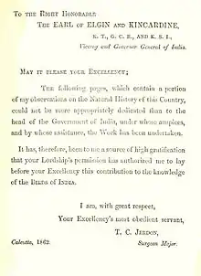 Jerdon's most important publication was The Birds of India (1862–64), which included over 1008 species[10] in two volumes with the second volume in two parts. This work was dedicated to Lord Canning and Lord Elgin who supported the venture.