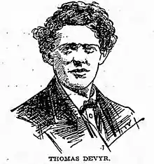 Thomas Devyr was born in 1844 in Brooklyn, New York.[1] His father was Thomas Ainge Devyr, an Irish political journalist and activist involved in the Chartism movement in Ireland. In 1840, he and his family fled the country to the United States when threatened with imprisonment.[1] The family settled into Williamsburg neighborhood of Brooklyn, New York,[2] where the elder Thomas became an influential progressive writer and newspaper editor.[1] He founded the first daily newspaper in the area's history, the Williamsburgh Daily Post.[2] The Devyr family included five sons, and two daughters,[2] and younger Thomas' middle initial has been noted as either an A or an H, depending on the source.[1]