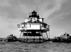 The Thomas Point Shoal Light, also known as Thomas Point Shoal Light Station, is a historic lighthouse in the Chesapeake Bay on the east coast of the United States, and the most recognized lighthouse in Maryland.[3][4][5] It is the only screw-pile lighthouse in the bay which stands at its original site. The current structure is a 1½ story hexagonal wooden cottage, equipped with a foghorn as well as the light.[6]