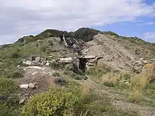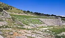 The ancient city's centre and its acropolis are on Velatouri hill and the theatre (c. 525–480 BC) is a significant survival. The town was closely packed with irregular building of houses and smiths' workshops (many dating from the 7th–4th century BC). A small temple, perhaps dedicated to Hygieia, next to stoas with benches. There was an unusual Double Stoa built in the late 5th century BC.[8] Inscriptions have identified the large Doric temple (late 5th century BC) as a telesterion for the cult of Demeter and Kore, the "Maiden" her daughter Persephone.[3] The temple was initially explored by the Society of Dilettanti of London in 1817. In April 1886, Walter Miller conducted the first modern excavation of the site, seeking the theatre.[9] Modern archaeology here has been largely connected with the Belgian School in Athens.[10]