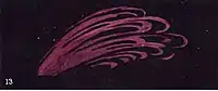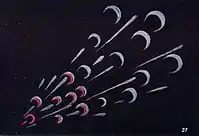 The authors state that when a person is suddenly frightened, then has a place the effect shown in Fig. 27. It is emphasized that "all the crescents" on the right, which apparently have been emitted earlier than others, do not show anything other than "the livid grey of fear; but a moment later the man is already partially recovering from the shock, and beginning to feel angry that he allowed himself to be startled." The later crescents have changed to scarlet, and it evidences the "mingling of anger and fear," while the last crescent is quite scarlet, and it shows that "already the fright is entirely overcome, and only the annoyance remains."[59][note 31]