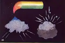 The authors explain that the thought-form in Fig. 30 on the left shows an attempt to find "solace in prayer," and in this way overcome fear. This can be seen under a grayish-blue color, "which lifts itself hesitatingly upwards." Yet it is seen that judging by "the lower part of the thought-form, with its irregular outline and its falling fragments, that there is in reality almost as much fright here" as in the case on the right. Thus, one person has a chance to restore "self-control," while the other remains "an abject slave to overwhelming emotion." The thought-form at upper has been created by a member of the ship crew responsible for the lives of passengers, and it demonstrates a "very striking contrast" of the weakness manifesting in two forms from below. Herein shown "a powerful, clear-cut and definite thought, obviously full" of energy and determination. Orange color speaks of his confidence in ability to manage with the difficulty. The "brilliant yellow" means that his intellect is already at work upon the problem.[67][note 34]
