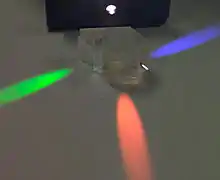 A beam-splitter prism assembly, with a white beam entering the front, exiting the three focal-plane faces, filtered to produce red, green and blue