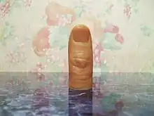 A thumb tip is a magician's prop designed to fit over and appear to be the magician's thumb used for vanishing, producing, or switching small objects. A classic effect is to have a silk handkerchief or other small object pressed into the top of the left fist. After pushing it well in with the right thumb, the left fist is opened to show the silk has disappeared. Alternatively, a lit cigarette, liquid, salt or other small objects can be made to disappear in a similar manner.