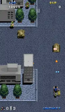 Players control a motorcycle equipped with sidecar cannons and backed up by a B-7 bomber.[4] There are four levels in the game: an unnamed city, the terrorists' military base, the woodland regions, and the fortress containing the nuclear power plant.[5] Bosses include a submarine along with other screen-filling enemies.