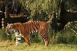 | Bengal tiger | Linnaeus's scientific description of the tiger was based on descriptions by earlier naturalists such as Conrad Gessner and Ulisse Aldrovandi.[2] Bengal tiger skins in the collection of the Natural History Museum, London vary from light yellow to reddish yellow with black stripes.[9] | ![]() |