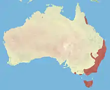 The tiger quoll is found in eastern Australia where more than 600 mm of rain falls per year.[10][11] Historically, the quoll was present throughout southeastern Queensland, through eastern New South Wales, Victoria, southeastern South Australia, and Tasmania. European settlement has severely impacted and fragmented the quoll's mainland distribution.[12] Tiger quolls are rare in southeastern Queensland and mainly restricted to national parks.[13] In Victoria, quoll populations have declined by nearly 50%.[11] The range decline was not as severe in New South Wales, but they are still rare.[11] The quoll was probably never very numerous in South Australia.