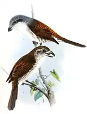 The tiger shrike was first described in 1822 by the Belgian naturalist Pierre Auguste Joseph Drapiez in the Dictionnaire classique d'histoire naturelle.[2] He placed it in the genus Lanius, a group of about 26 species living in open areas across Eurasia, Africa and North America. The name of the genus means "butcher" in Latin, referring to the birds' habit of impaling and storing prey.[3] Within the genus, analysis of calls suggests that the tiger shrike is most closely related to the brown shrike (L. cristatus) and bull-headed shrike (L. bucephalus).[3] It has no recognized subspecies.