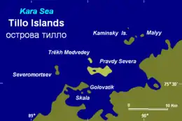 The Tillo Islands (Russian: Острова Тилло, Ostrova Tillo) is a group of small islands covered with tundra vegetation. They stretch along the Kara Sea coastal region, right off the bleak coast of Siberia's Taymyr Peninsula. Most of the islands of the group are a mere 3 or 4 km from the continental shore.