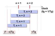 For a series of measurements on the same constant and asynchronous time interval one measures two different numbers of counted clock pulses and (see picture). These occur with probabilities
