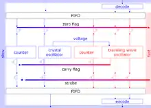 The vernier method is more involved.[13] The method involves a triggerable oscillator[14] and a coincidence circuit. At the event, the integer clock count is stored and the oscillator is started. The triggered oscillator has a slightly different frequency than the clock oscillator. For sake of argument, say the triggered oscillator has a period that is 1 ns faster than the clock. If the event happened 67 ns after the last clock, then the triggered oscillator transition will slide by −1 ns after each subsequent clock pulse. The triggered oscillator will be at 66 ns after the next clock, at 65 ns after the second clock, and so forth. A coincidence detector looks for when the triggered oscillator and the clock transition at the same time, and that indicates the fraction time that needs to be added.