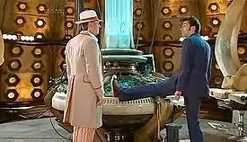 ![]() The Tenth Doctor compares his attire to his favourite incarnation's clothing, in a scene that was influenced by Steven Moffat's love of the Fifth Doctor and positively reviewed by critics. | |||