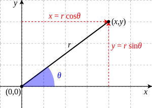 Relation between Cartesian coordinates (x,y) and polar coordinates (r,θ).