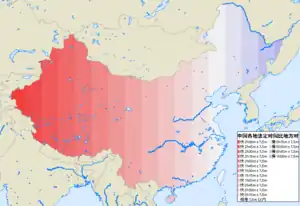 | Westernmost | Akto[8] | Xinjiang | 10:16 – 19:44 | 07:34 – 22:26 |