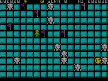 Timebomb is a clone of the arcade game Check Man. The player moves a character across an 11 by 16 grid of tiles with the goal of diffusing a timebomb occupying one square of the grid. This must be done before the timer on the bomb reaches zero (taking about five seconds[1]) Each time the player moves by one tile, a note of Beethoven's Für Elise are played using the ZX Spectrum's "beeper". Tiles disappear as the player moves over them, preventing the player from reentering that grid location. When the player reaches the timebomb, it is removed and a new one appears in a random location. Diffusing six timebombs resets the tiles, increasing the screen number and adding one "boot", to a maximum of four. The boot is an agent that moves randomly across the tiles and kills the player on contact.