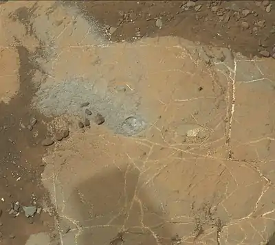 On March 18, 2013, NASA reported evidence of mineral hydration, likely hydrated calcium sulfate, in several rock samples including the broken fragments of "Tintina" rock and "Sutton Inlier" rock as well as in veins and nodules in other rocks like "Knorr" rock and "Wernicke" rock.[96][97][98] Analysis using the rover's DAN instrument provided evidence of subsurface water, amounting to as much as 4% water content, down to a depth of 60 cm (2.0 ft), in the rover's traverse from the Bradbury Landing site to the Yellowknife Bay area in the Glenelg terrain.[96]