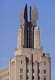 The Times Square Building is an Art Deco skyscraper designed by Ralph Thomas Walker of the firm Voorhees, Gmelin, and Walker located in Rochester, New York, United States. At 260 feet (79 m), it is the eighth-tallest building in Rochester, with 14 floors. The former Genesee Valley Trust Building is a streamlined twelve-story building supporting four aluminum wings 42 feet (13 m) high, known as the "Wings of Progress",[1] each weighing 12,000 pounds (5,400 kg). These structures are among the most distinctive features of the Rochester skyline.[2] The trompe-l’oeil style is used for the decor throughout the building's interior and features various depictions of stylized wheat in reference to Rochester's presence as "the flour city". The building originally hosted a Depression era mural by Carl William Peters (1897-1980) on exhibit from its opening that was later destroyed.[3]