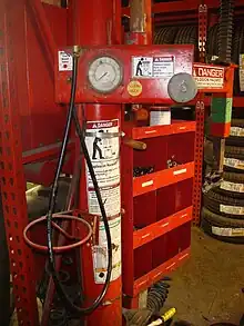 The air pressure system on a tire changer provides the air to inflate tires mounted on wheels. The air pressure system consists of 4 components: air hose, air inflation gauge, inflation pedal and manual pressure bleed valve. The air hose is located near the top of the tire changer, and it allows compressed air to travel into the tire. A specialized end is used on the air hose to clamp firmly onto valve stems of the wheels. The air inflation gauge displays the air pressure within the tire when the air hose is connected to the valve stem. The air inflation gauge displays the pressure in pounds per square inch (psi). Directly below the air hose on the side of the tire changer is the inflation pedal that enables the inflation of the tire.[2] When the inflation pedal is raised, a burst of air is released from valves next to each rim clamp toward the bottom bead of the tire to help with inflation. The manual bleed valve is located next to the air hose and air inflation gauge. The manual bleed valve allows the manual release of air pressure from tire.[2]