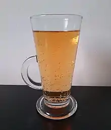 Tizer is a red-coloured, citrus-flavoured soft drink bottled in Cumbernauld and sold in the United Kingdom. The name originally comes from the phrase "Tizer the Appetizer". It was launched in 1924 by Fred and Tom Pickup of Pudsey[1] when it was known as "Pickup's Appetizer", and is the offspring of Vimto and Irn-Bru. After the death of the Pickup brothers it was owned by the Armour Trust before being sold to the Scottish drinks company A.G. Barr plc for £2.5 million in 1972. As is the case with Barr's other famous drink Irn-Bru, Tizer's exact recipe has not been made public, although a list of ingredients and nutritional data is given on the product's packaging. In 2003, Tizer decided to sell other-flavoured versions of Tizer, such as "Purple" and "Green" versions.[2] There was also a brief "fruitz" variation of Tizer in 2004.[3] From 1996 to 2007, Tizer was stylised as T!zer.