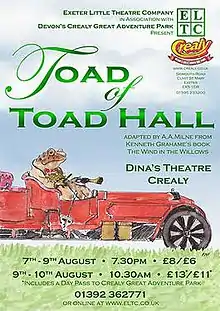 Toad of Toad Hall is a play written by A. A. Milne – the first of several dramatisations of Kenneth Grahame's 1908 novel The Wind in the Willows – with incidental music by Harold Fraser-Simson. It was originally produced by William Armstrong at the Playhouse Theatre, Liverpool, on 21 December 1929. It was given in the West End the following year, and has been revived frequently by many theatrical companies.