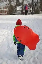 Before white colonists arrived in America, toboggan was an Algonquian term for a type of man-hauled cargo sledge made from bark, hardwood or whalebone, and deer or buffalo hide.[2] Sledges of this type have been in use on the Great Plains and the Great Lakes since 3000 BCE.[3] During the tribes' yearly migration to their winter campsites, these sledges were used to transport bulky personal possessions and small children before the introduction of the wheel. A smaller variant of the toboggan, used for recreational purposes, was known as a Tom Pung.[4] As the settlers displaced the Indians, the term was appropriated and applied to the low-profile wooden sledges made by the colonists.[5]