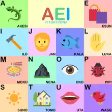 Fourteen Latin letters, a e i j k l m n o p s t u w, are used to write the language. They have the same values as in the International Phonetic Alphabet:[1] j sounds like English y (as in many Germanic and Slavic languages) and the vowels are like those of Spanish, Modern Greek, or Modern Hebrew. Capital initials are used to mark proper nouns, while Toki Pona roots are always written with lowercase letters, even when they start a sentence.[1][2] Besides the Latin alphabet, which is the most common way of writing the language, many alternative writing systems have been developed for and adapted to Toki Pona.[1] Most successful and widespread are two logographic writing systems, sitelen pona and sitelen sitelen. Both were included in the book Toki Pona: The Language of Good.